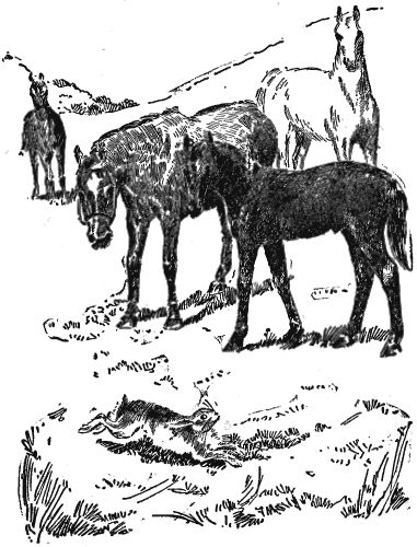 And soon the dogs were all tearing down the field of young wheat next to ours. I never heard such a noise as they made. They did not bark, nor howl, nor whine, but kept on a "yo! yo, o, o! yo, o, o!" at the top of their voices. After them came a number of men on horseback, all galloping as fast as they could. The old horses snorted and looked eagerly after them, and we young colts wanted to be galloping with them, but they were soon away into the fields lower down; here it seemed as if they had come to a stand; the dogs left off barking and ran about every way with their noses to the ground.